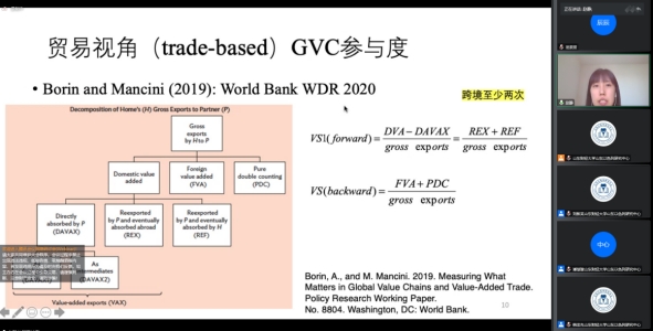 赵静博士从宏观层面和微观层面对全球价值链的核算展开了详细介绍,演示了UIBE GVC指标体系数据库学术版本和政策版本的使用方式,并且从贸易视角、生产视角、企业视角等角度深入讲解了全球价值链参与度、全球价值链位置的测算方法。