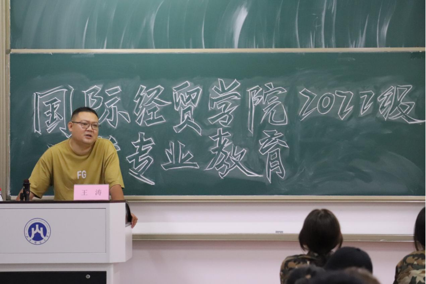 副院长刘伟全老师,院长助理王磊老师、国际商务教研室王涛老师、李大凯老师,于9月26日晚在圣井校区6号楼为全体新生举办入学专业教育讲座。