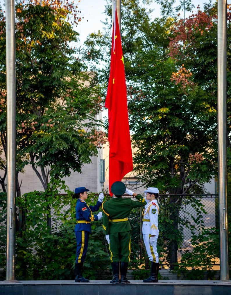 清晨七时整,升国旗仪式正式开始。国旗仪仗队的同学们迈着整齐划一、铿锵有力的步伐,护送着五星红旗走向旗杆。全体师生共唱国歌,注视着五星红旗冉冉升起,在熠熠晨光中迎风飘扬。