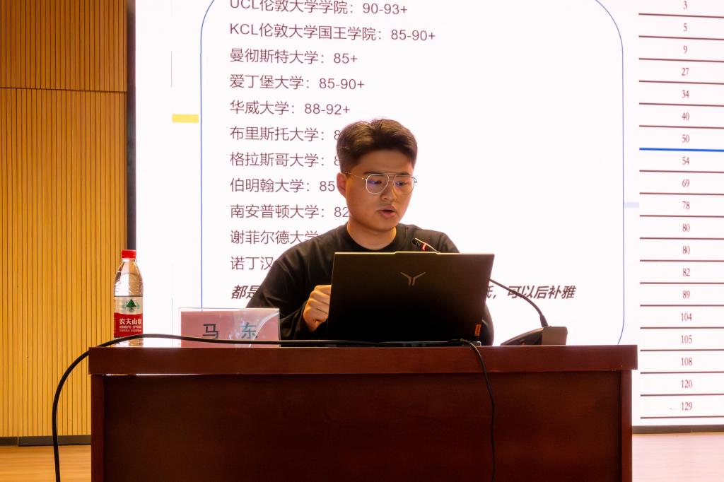 在留学深造方面,优秀学生代表马东以绩点86、雅思6.5 的成绩收到了QS排名30的澳大利亚国立大学的录取通知书。分享会上,他介绍了山财学子热门就读的海外、境外高校的相关数据,从学习绩点要求、录取实际成绩偏差、每所学校特殊条件等方面交流了自己的择校依据,并从申请前期、中期、后期三个阶段详细分享了每个阶段的要求和注意事项,提醒同学们在校期间要努力学习专业课和语言,为留学做足基础准备。