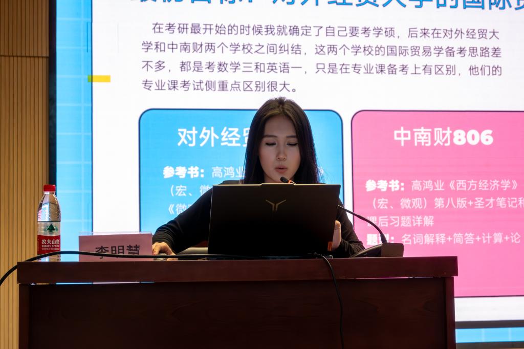 在考研升学方面,李明慧作为上岸中南财经政法的优秀学生代表,先简单讲述了她的择校经过,随后详细介绍了她的备考经验,她着重从专业课侧重点与思维考察维度分析指出备考不仅是知识的输入,还要提升思维逻辑,要非常熟悉考查内容和重难点。她分享了学科备考心得:数学学习贵在专一,务必吃透每一道错题,学习质量远比数量重要;英语学习要以单词为根基,借助手机软件辅助背诵,有规律高效地推进阅读题的练习;政治复习需精准聚焦核心要点,用好每一套模拟题。