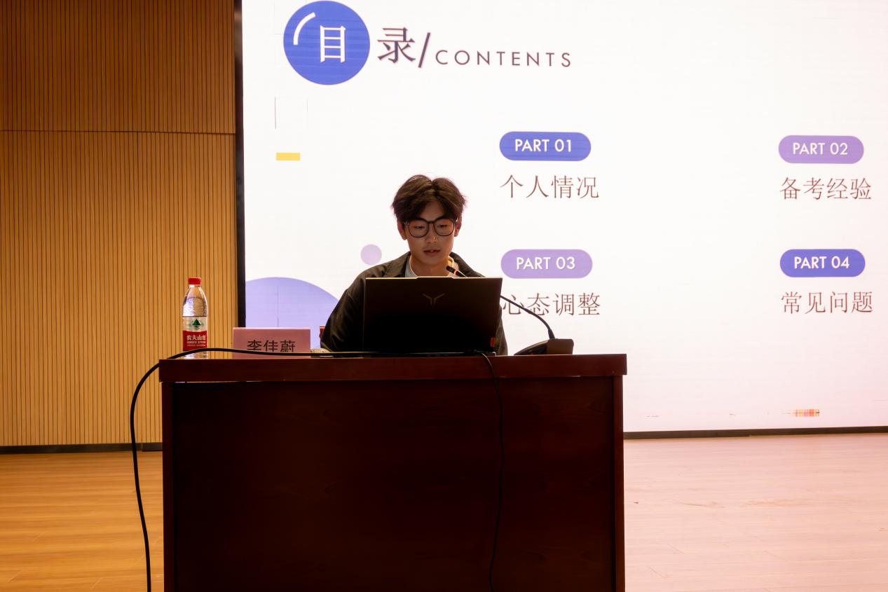 李佳蔚作为上岸对外经贸大学的优秀学生代表在讲述择校和备考学习经验之外,重点提到了备考心态的重要性,他提出:“学习效率至关重要。要保证学习效率的前提并不是每天输入大量知识,而是坚守自己节奏,保持良好稳定的心态,不被网络上繁杂信息干扰,不被连篇错题所击退,不被考研战友们的进度所扰乱。”同时,他叮嘱同学们一定要重视身体健康,每天保证一定时间的运动锻炼,为学习提供充足的精神和体力支持。