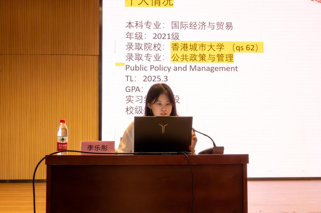 优秀学生代表李乐彤在国内考研上岸和境外高校录取的权衡中,选择前往香港城市大学就读。她从自身角度出发,提醒同学们要尽早树立未来目标,确定人生理想,将升学深造要与个人人生规划相结合,选择能够实现目标的路径前行。分享会上,她详细介绍了香港各所高校的特点和录取要求,帮助同学们了解香港地区的教育和生活情况,对于有留学规划的同学们,她建议:一方面要注重平时积累,重视成绩、实践和实习;另一方面要保持良好心态,不要因为备课和申请中遇到的挫折而否定自己。