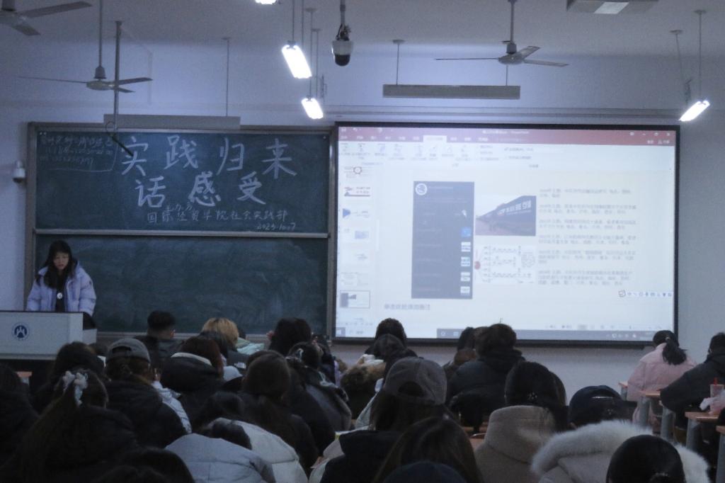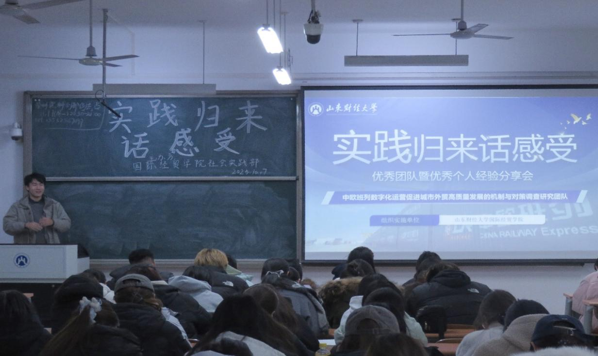 最后,2024级学生于昊橙以自身调研经历为切入点,真诚地分享了实践过程中的所见所感,鼓励同学们勇敢尝试、积极投身于实践当中。同时,他结合调研主题,解读了“三千计划”在中欧班列相关研究中的实践导向。真挚亲切的分享引起了在座同学的强烈共鸣,展现出国贸学子“知行合一”的精神风貌。