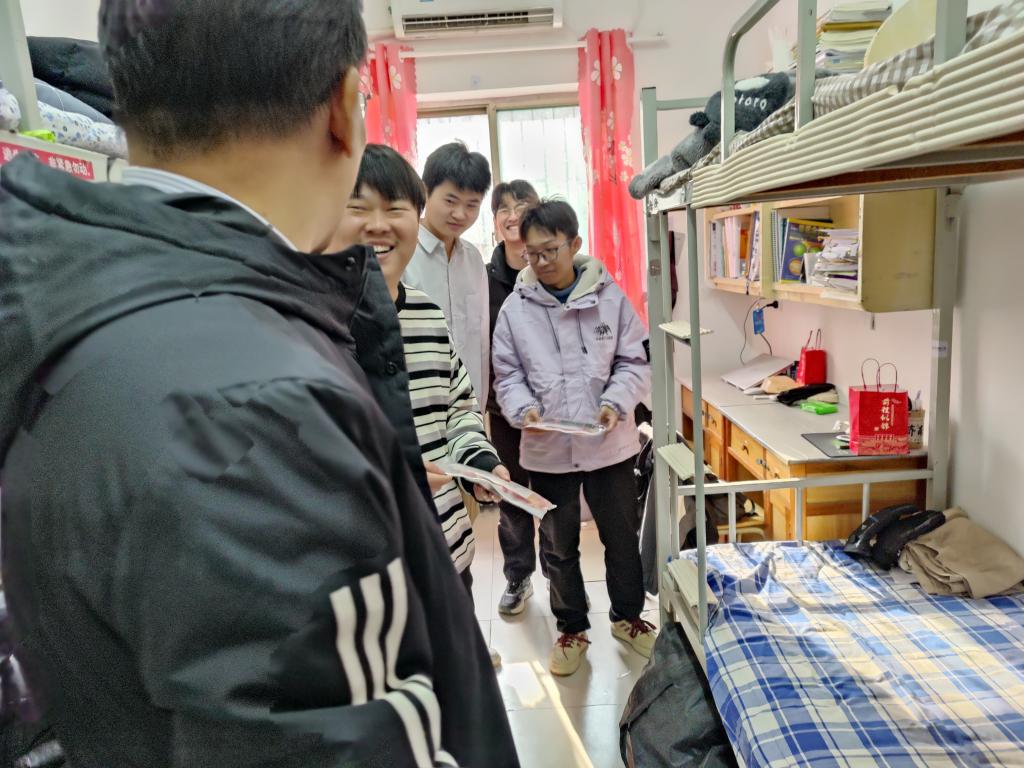 学院党委副书记郝秀峰与毕业班辅导员一同走进学生宿舍,亲切慰问备考的同学们:学院永远是大家的坚强后盾,有任何困难及时联系老师们。并为学子们送上装有“一研为定”贴画、涂卡笔、橡皮、文件袋等文具的“考研礼包”。