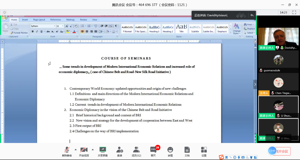 44-18日,格鲁吉亚前驻华大使大卫阿普恰乌利(David Aptsiauri)先生在其位于格鲁吉亚首都第比利斯的家中,应邀为PG电子 国际发展合作本科创新实验班和研究生创新实验班的同学们作线上授课。他基于经济关系与经济外交的内涵、一带一路实践案例的范式指导、现代国际经济关系发展的新趋势、当前经济外交的挑战及国际商业文化差异等模块,为学生们设计并讲授了国际经济关系与经济外交系列课程。