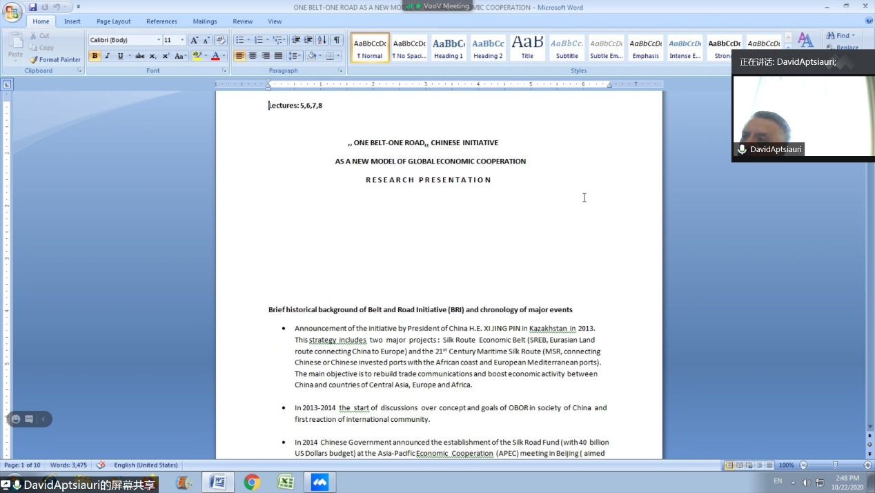 国际发展合作专业研究生创新实验班的培养方案,9月10日-12月17日,格鲁吉亚前驻华大使大卫•阿普恰乌利(David Aptsiauri)教授在本学期为实验班讲授了“国际发展合作”课程。受疫情影响,本学期课程仍然采用线上方式进行,大卫教授在其位于格鲁吉亚首都第比利斯的家中,每周四的下午为同学们作线上授课。