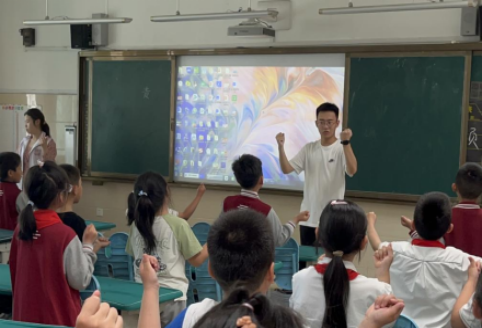 组织学生志愿者集体前往济南高新区黄金谷学校进行志愿服务活动,协助班级学生进行六一汇演准备工作。