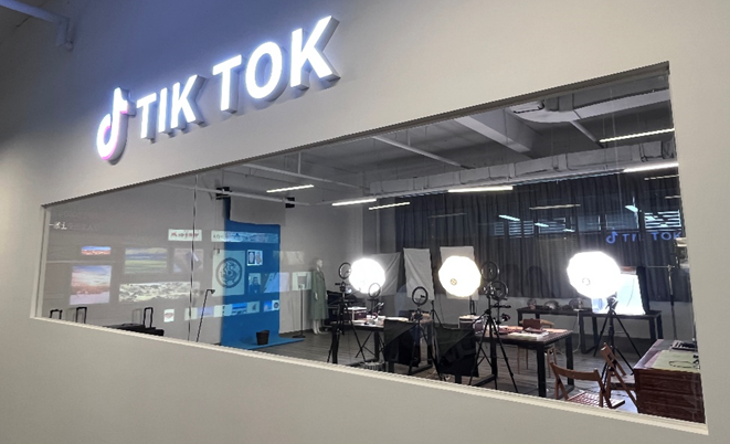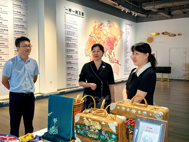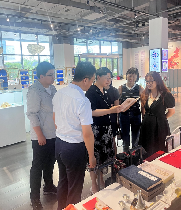 在文化尚品集团的中国美学展厅,方慧院长一行跟随企业宣传人员,参观了戏曲文化、黄河物语、大漠风情、器物文化、自然共生等一系列文化产品,了解到文化尚品集团的IP设计创意、文化产品交易、海外文化贸易中心与跨境电商平台等创新体系,实地参观了文化尚品集团的Tik Tok电商直播基地。