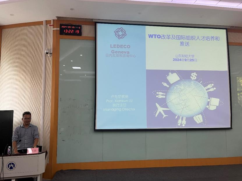 的研究生进行了授课,他以“WTO改革及国际组织人才培养和推送”为主题,首先回顾了中国加入WTO的历史背景及其对中国经济发展的深远影响。随后,他深入剖析了当前WTO面临的挑战与机遇,并探讨了如何通过改革促进WTO的有效性和适应性。此外,他还分享了关于国际组织人才需求的变化趋势,强调了培养具有国际视野和跨文化沟通能力的专业人才的重要性。卢先堃教授结合自身经历,详细介绍了国际组织工作的特点,以及如何有效地将优秀人才推向国际舞台。他鼓励学生们不仅要扎实专业知识,还要提高外语水平和个人综合素质,以更好地适应未来的工作环境。