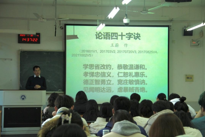 王蔚教授还讲解了孔子与《论语》,用一首打油诗描述了孔子的一生,通过孔子对人性的把握教导同学们要及时思考反省自我,改正自身错误;告诫大家在生活中要自我约束,把握好分寸,不能任性。